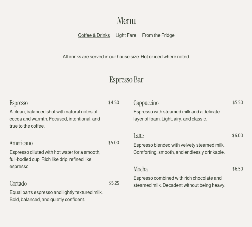 The menu points to a focused approach: specialty coffee, ceremonial-grade matcha, and a small selection of simple bites.2